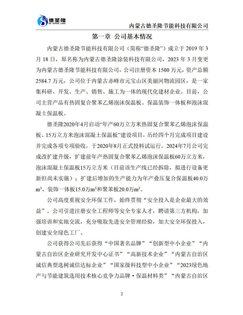 內蒙古德圣隆節(jié)能科技有限公司成立于2019年,位于內蒙古赤峰市元寶山區美麗河鎮物流園區,是一家集科研、開發(fā)、生產、銷售、施工為一體的現代化建材企業(yè)。公司主營產品:熱固復合聚苯乙烯泡沫保溫板、保溫裝飾一體板和泡沫混凝土保溫板,年生產能力達到6000000平方米。
